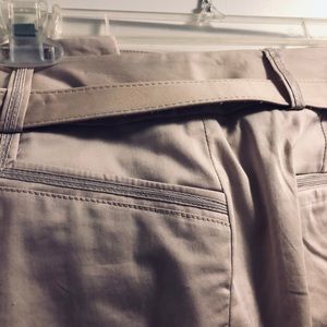 Very cute, cuffed at bottom, belt included beige capris with tags! Great deal, half the original price! Cute decal on the back side, underneath belt. Belt is cloth, thick brown color. Soft pants very classy and are flattering with heels or sandals! No flaws.