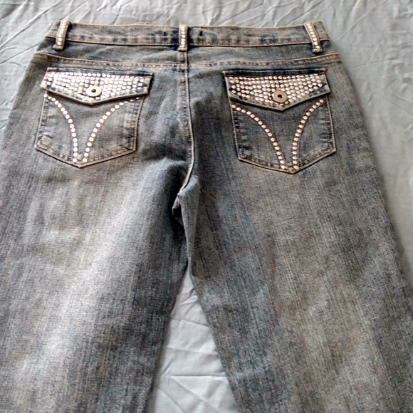 Distressed Jean capris with silver grommets on pockets and belt loops.