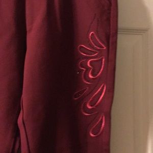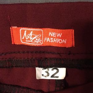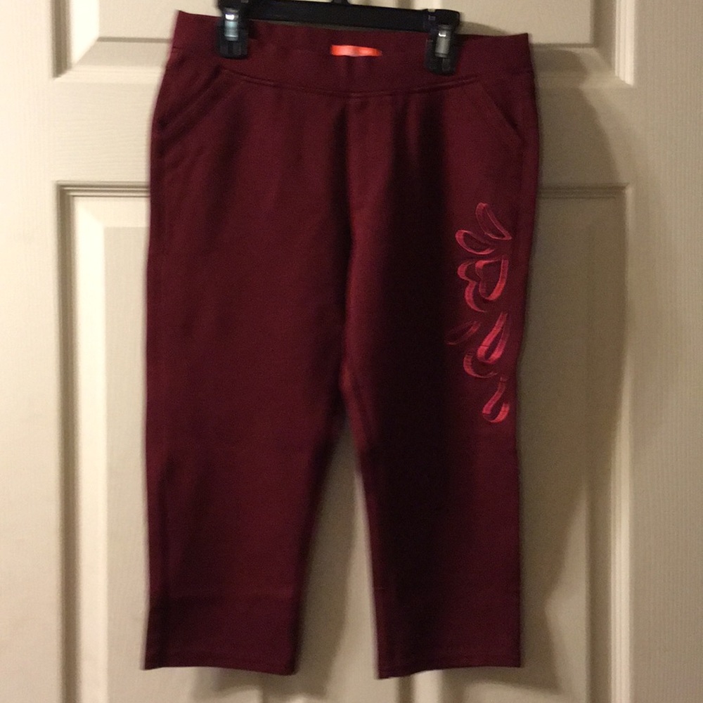 Capris with spandex. Has design down left front leg and designs on back pockets. They are burgundy colored with black in designs. I got them in Vietnam and the size says 32 but I believe that to be a size 4. There like new in excellent condition and no stains are tears.their very nice .