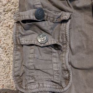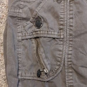 Light olive green, 6 button pockets with false zippers, belt loops.