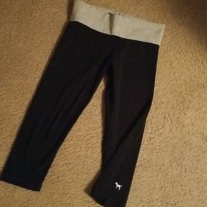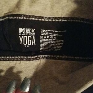 Pink black cropped yoga pants. Multicolor geometric writing on waistband ..waistband is gray. I also have the matching lace bralette on my page. Just let me know ๐๐๐๐๐