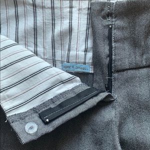 Black and gray striped Capri pants, large belt loops with flat waistline and invisible button. Wide legs. Size medium.