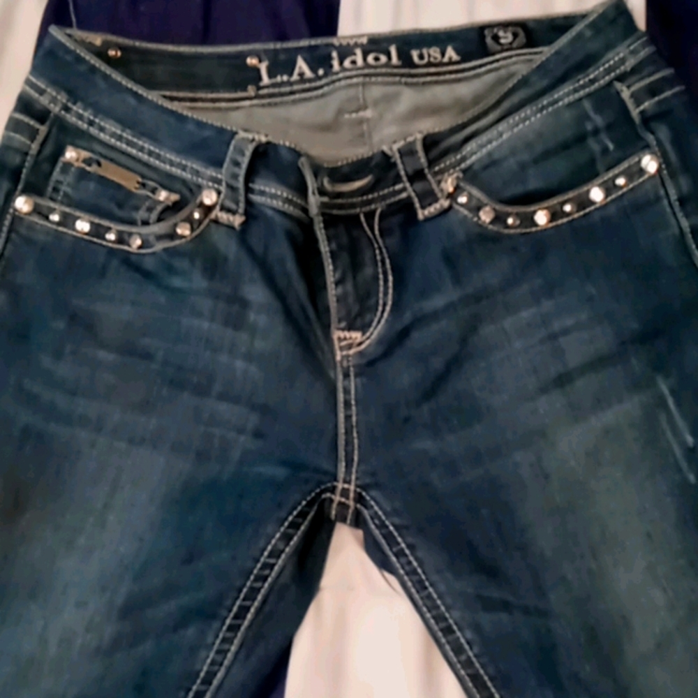 These capris have all the jewels on them nothing's missing in great shape their la idol USA there's one spot by the left pocket right beside the butt it's a fringe it's not really a spot other than that they're great capris and in good shape