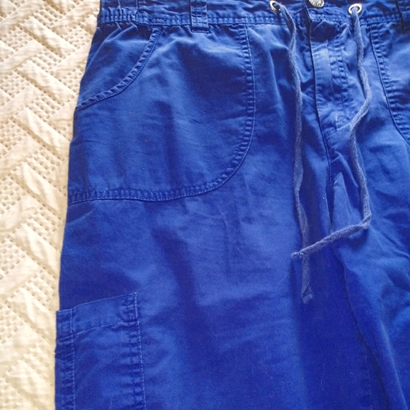 BlueNavy with a zipper as well as a tie. Front and back pockets (Six pockets in all) They are a large but would easily fit Xtra large.