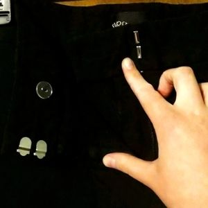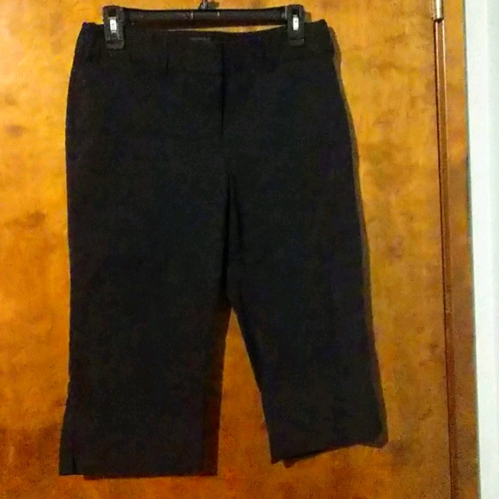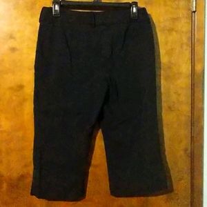 Black stretchy capris, no pockets, zipper with button and clasp closer.