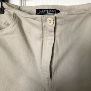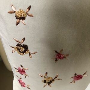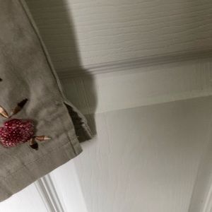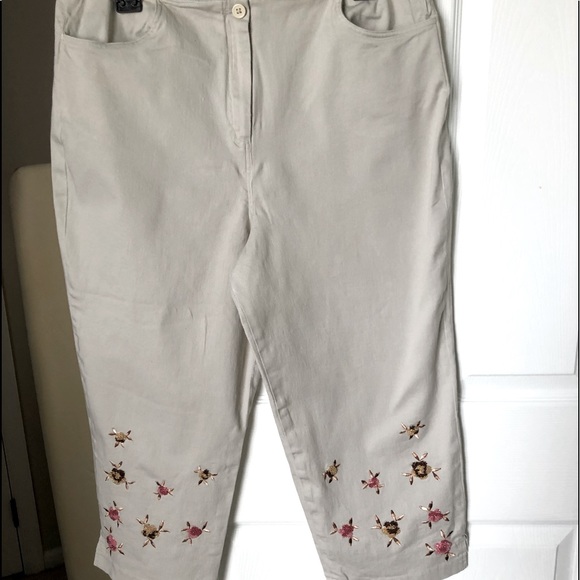Tan zip up button closure with two front pockets. Flower beading detail at bottom of pants with a small putter slit. Very comfortable and washable.