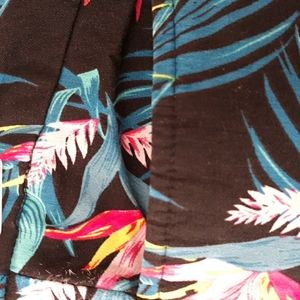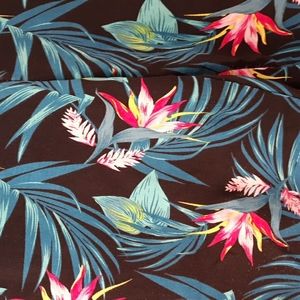 Tropical print capris with 2 pockets up near waist. 76% rayon, 21% nylon, 3% spandex. Stretchy material. Waistband to hem, about 30". Inseam-20". Size is M (8-10).