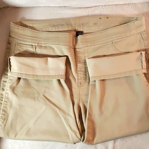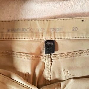 They are womens plus khaki capri's size 20 from Avenue. I had to wear them folded on the bottom because I am shirt but they are not stitched so they can be rolled down. There is some pulling on the inner thighs as seen in photos.