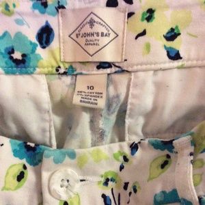 Floral capris, white with blue flowers. Size 10, 98% cotton, 2% spandex, Machine wash.