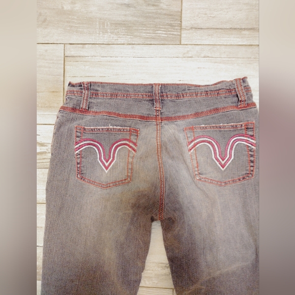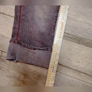 The tags were cut out. I compared these with other jeans and they are a Size: 29. The color is like a grayish- black with hot pink stitching.