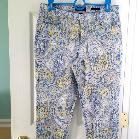 Ikat stretchy mixture of blue, pink, yellow and green. Front and back pockets, belt loops. Cotton and spandex.