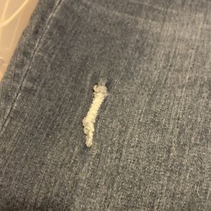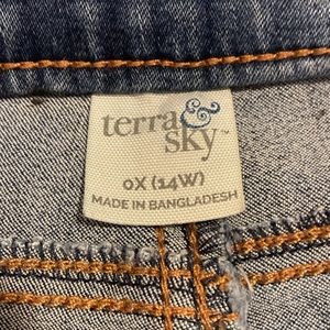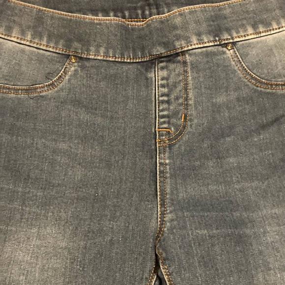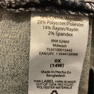 Ankle, cropped skinny jeans with raw hem and distressed look. Elastic waist band. Size 0X or 14 W