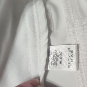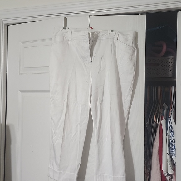 white satin capri pant with cuffs at ghe bottom of the pants 50% polyester 47% cotton3 % spandex