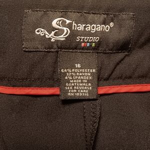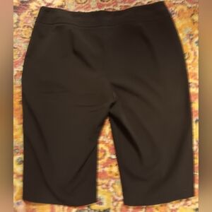 Black capri's...more of a peddle-pusher length Double clasp, button, & zipper, slit pockets
