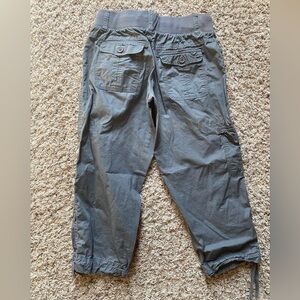 Gray Capri pants. Cargo pockets on waist waiste is elastic with a tie. Ties at bottom of legs. Knee length or just below