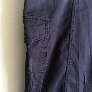 Used Navy Blue capris by Croft & Barrow in size 18. Zipper and button closure. Material is 98% cotton and 2% spandex. Two side slit pockets in front, two small pockets in back with button closures and two side leg pockets with button closures. Length is 30 inches and inseam is 19 inches. Good condition.