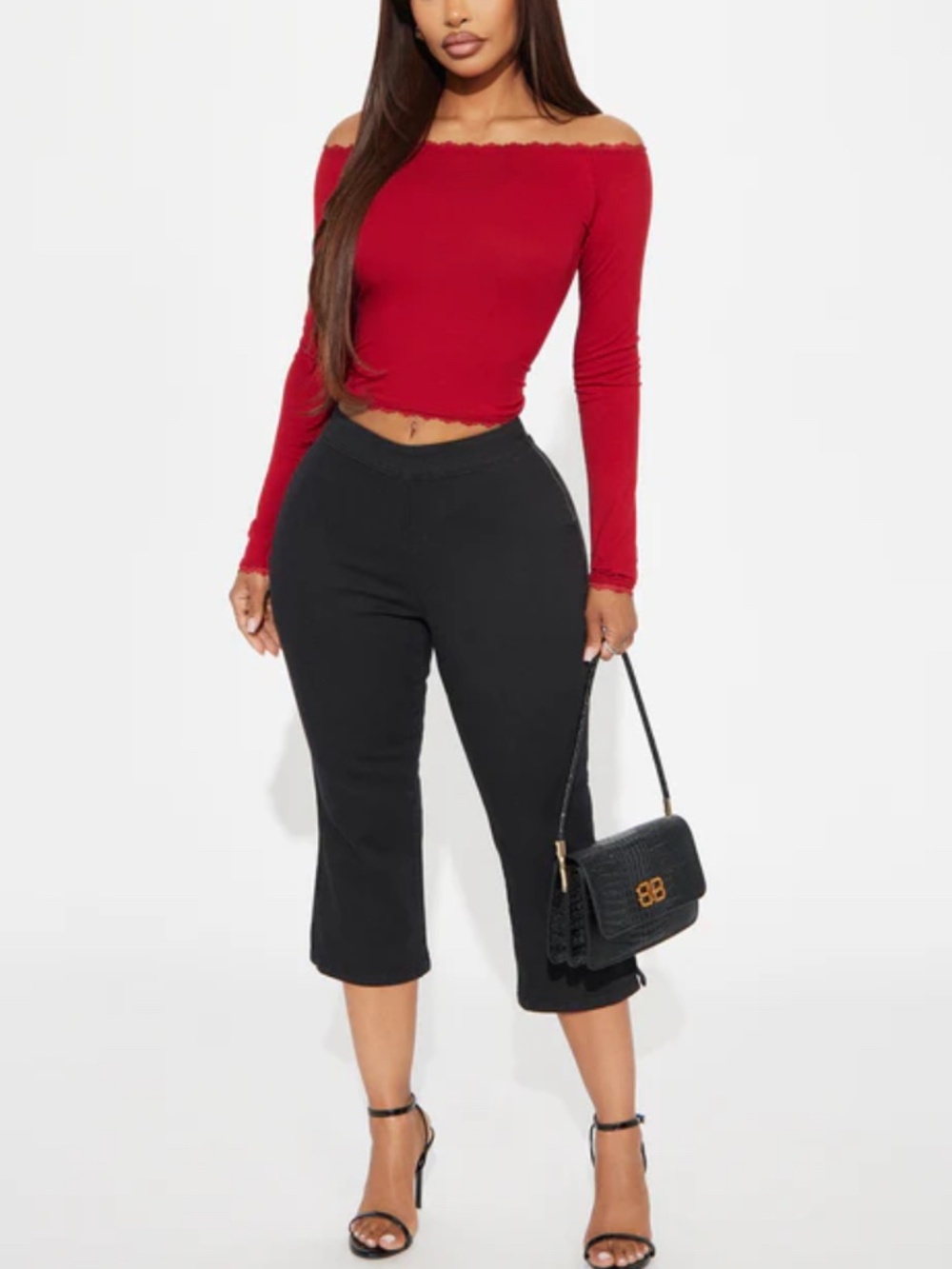Dark stretch denim wash capri with a flare leg worn once had a zipper on side