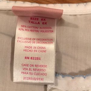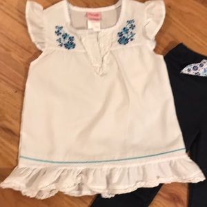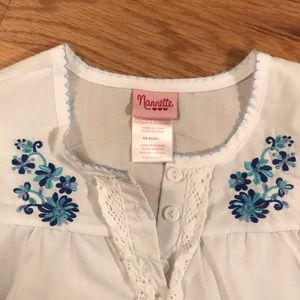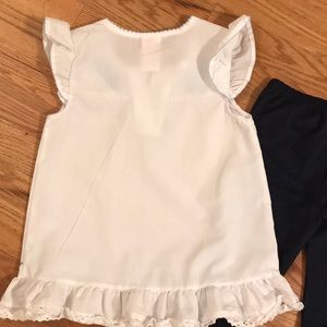 Adorable Nannette Capri set. White cotton top with lace and beautiful blue stitching Capris are cotton polyester blend, navy blue, very light weight fabric. Set is girls size 6X. Like new condition.