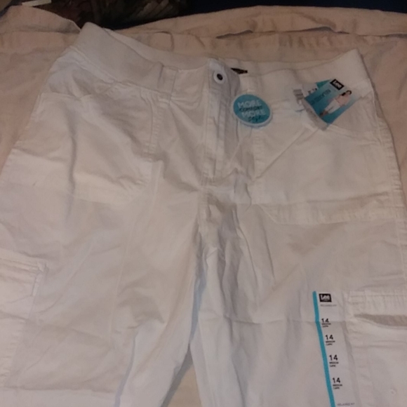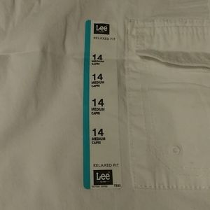 These white capri pants has side pockets front and back pockets zipper in front cufff on leg