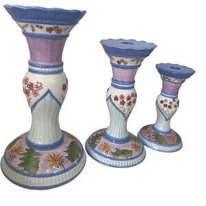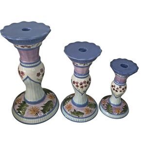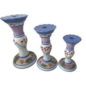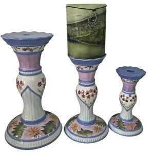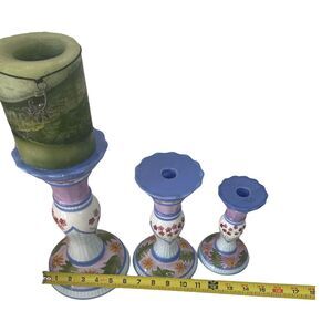 Capriware 3-Piece Pillar Candleholder Set Blue Purple Floral Hand Painted VTG