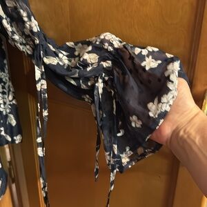 Blue sheer top, lightly textured, slight bell sleeve, floral