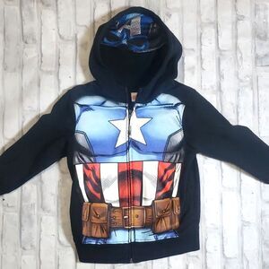 Kids' hoodie with Captain America design. Features a star and shield graphic. Perfect for superhero fans.
