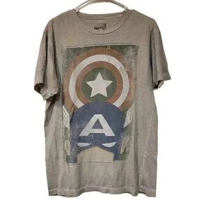 Captain America Marvel Comics Men's Distressed Ivory Cotton Knit Minimalist Shield Over Mask Graphic Image Crew Neck Short Sleeve T-Shirt EUC sz L pit to pit 19 Length 28 Sleeve Length 8.5