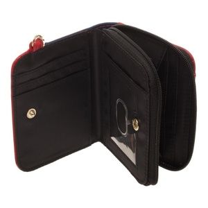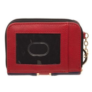 Very nice mini bifold wallet with a key chain clip. It resembles Captain Marvel's outfit as seen in the comics. It has a snap closure and a zipper pouch. There's plenty of room for cards and cash. Officially licensed, made by Bioworld.