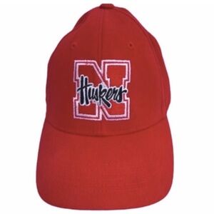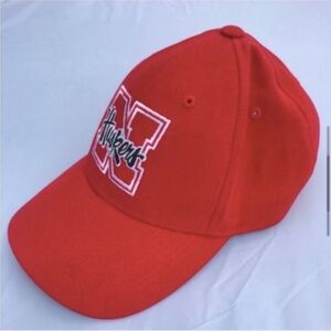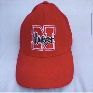 F7 Hat/Cap Captivating Headgear Adult Adjustable Hook & Loop Strap Nebraska Cornhusker Logo in red and black on face. Also Huskers type on rear strip in white / Red Cap 100% Cotton