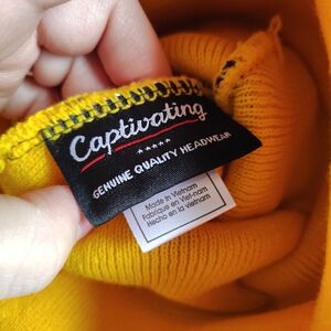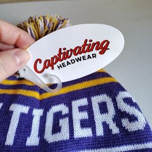 The product is a new with tag LSU Tigers stocking cap hat by Captivating Headwear. This yellow and purple hat features an embroidered LSU Tigers logo, making it a perfect accessory for football fans and supporters of the team. Designed for unisex adults in one size, this hat is ideal for showing off team spirit and staying warm while cheering on the LSU Tigers during games or outdoor activities. The high-quality stitching and vibrant colors make this cap a must-have for any LSU fan's collection.