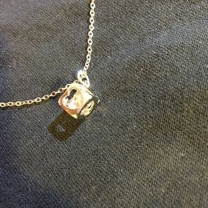 8inch long silver necklace. Small box with heart shape cut out holding a diamond in the middle.