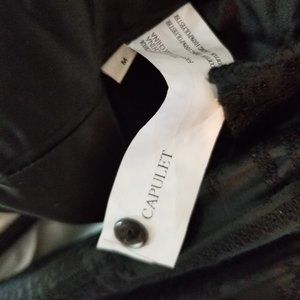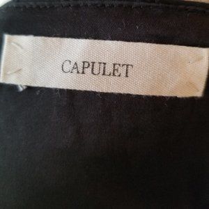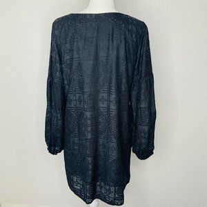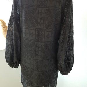NWT Capulet Revolve black embroidered mini shift dress has lantern sleeves that end at a fitted wrist with two button closure. Dress is lined in black however sleeves are sheer. Dress has two slits at sides, two pockets and deep V neck in front. NWT makes a great gift item! Measurements in pics. 100% cotton, liner is 100% Polyester, no stretch.