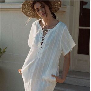 Tonal embroidery brings delicate detail to this airy lightweight Capulet mini dress . Lace -up ties fasten the half -placket. Short sleeves.Lined. Brand new with tags.
