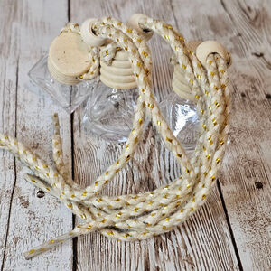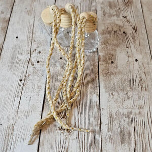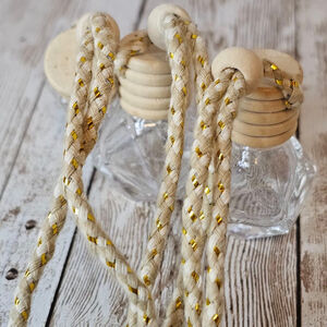 Three new car air fresheners, each featuring a clear glass, faceted cube-shaped attached to a beige cotton cord with gold accents. The cord has wooden beads and a stacked wooden stopper. The fresheners are empty and untagged. The overall condition is new without tags or box; minor imperfections may be present due to the handmade nature of the item.