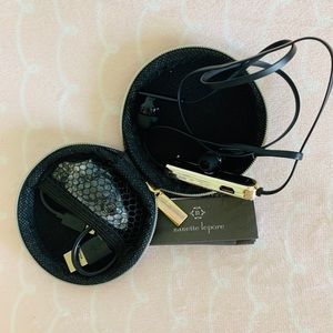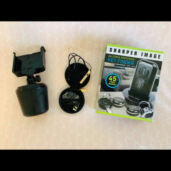 1 weatherproof phone holder (note that it only comes with 2 “rings”), Nantette Lepore Bluetooth ear phones (never used), Sharper Image car key finder (never opened)