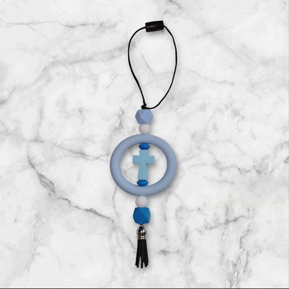 Stylish car charm featuring blue beads and a cross design. Accented with a black tassel.