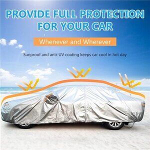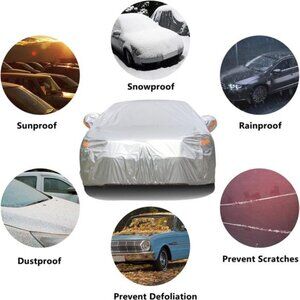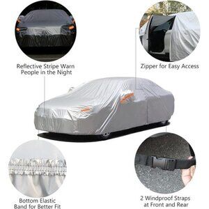 🧿【Car Cover Feature】1) Driver door zipper for quick and easy access when you leave something in the car. 2)Double windproof design: the front and rear curled elastic bands to make the car cover fit the body and 2 Windproof straps at front & rear to protect your auto cover by heavy wind. 3) 6pcs full-range reflective stripes warn people in the night. 4) Side mirror covers make the cover fit your vehicle better. 5)A free storage bag with a rope can be easily put cover into the trunk.