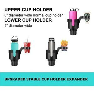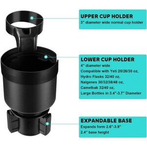 -DUAL CUP HOLDER HOLDER FOR CAR STORAGE: The upper cup holder for car is suitable for regular car cup holder with a diameter of 3’’. The lower cup holder for large tumblers, bottles and cups up to 4’’ wide, so far has compatible with Yeti 20/26/30 oz Hydro Flasks 32/40 oz Nalgenes 30/32/38/48 oz Camelbak 32/40 oz.