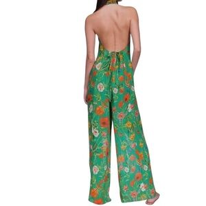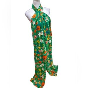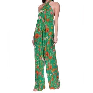 Cara Cara 100% silk Green/Orange Floral halter Jumpsuit lined scoop back size xs