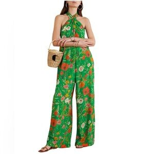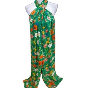 This Cara Cara jumpsuit features a vibrant green base adorned with bold orange floral & butterfly print, offering a striking contrast. The halter design with buttons and wide-leg silhouette provide a relaxed fit, perfect for warm weather. Scoop back with tie. Its light and airy 100% silk fabric ensures comfort while making a stylish statement. Lined. Just dry cleaned. Euc