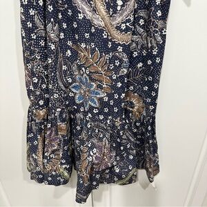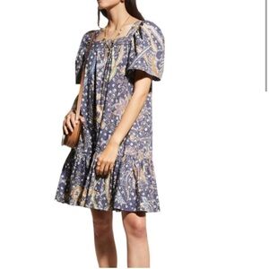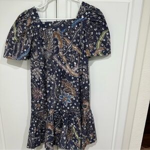 Cara Cara Navy Batik Janie Mini Dress, Square neck, Short sleeves, Side slip pockets, Shift silhouette, Ruffled hem, Mini length, Unlined, 100% cotton
