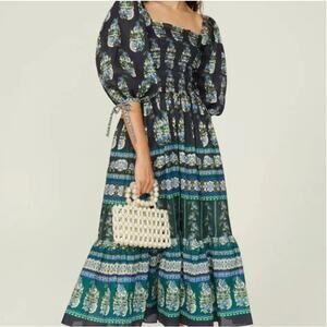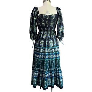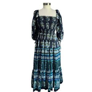 Cara Cara Jazzy Blue Green Print Puff Sleeve Smocked Cotton Midi Dress Sz S