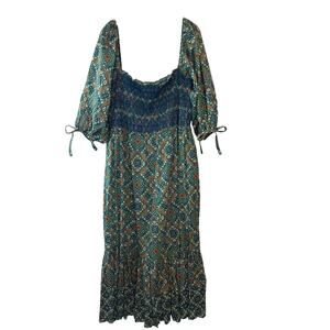 Cara Cara Moroccan Tile Teal Jazzy Midi Dress Size Large Boho Smocked Dress