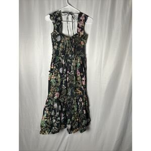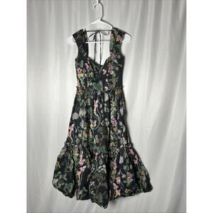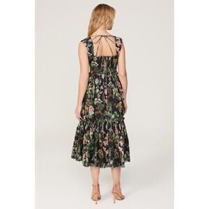 PLEASE SEE SELLER NOTES BELOW Vibrant florals bring this tie-back tiered midi dress by Cara Cara New York to life against a stark black background.