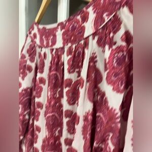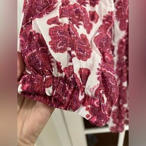 New w tags! Elegant red and white dress. Features intricate pattern. Long sleeves with a relaxed fit. Perfect for any occasion.