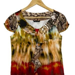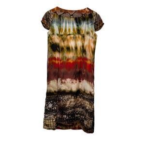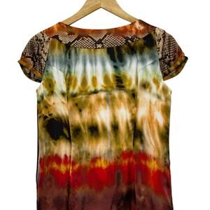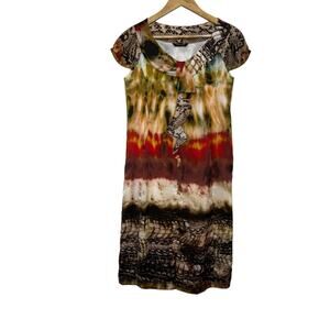 Cara Lotti Silk Sheath Dress Size 8 Brown Rust Yellow Cap Sleeves Scoop Neck