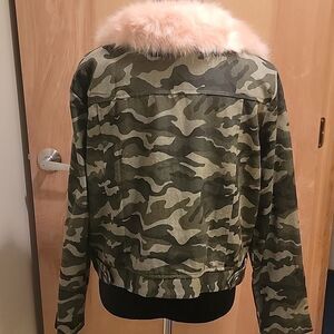 Stylish camouflage jacket featuring a soft pink fur collar. Perfect for adding a touch of flair to your wardrobe. never worn.