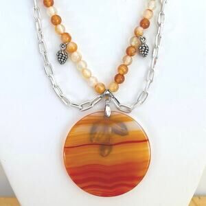 Carnelian Style Orange Beaded Necklace & Large Round Pendant w/ Silver Tone Chain & Charm Accent Charms & Round Pendant. Accents are leaf and acorn / pinecone / grape like charms with link chain. Approx. 16". It is in great condition. Please see pictures for condition and approx. size reference.