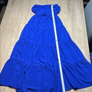 This stunning Caramel dress in a vibrant blue hue features a strapless neckline and a tiered, ruffled design that adds a touch of elegance. Perfect for cocktail parties or a night out, the sleeveless maxi dress offers a flowing silhouette that moves gracefully with every step.