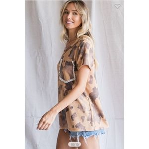 Caramel cow print top with v-neckline and front pocket with ruffles